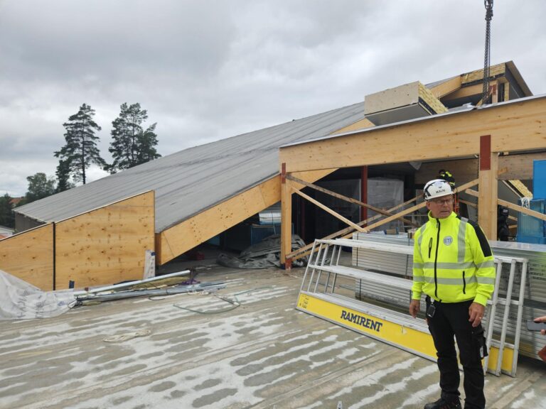 Nedan ser ni montagechef Hans Strömqvist ute på montagejobb av en passivhus skola i Mjölby. Idrottshallen monteras efter en mycket välförtjänt semester!